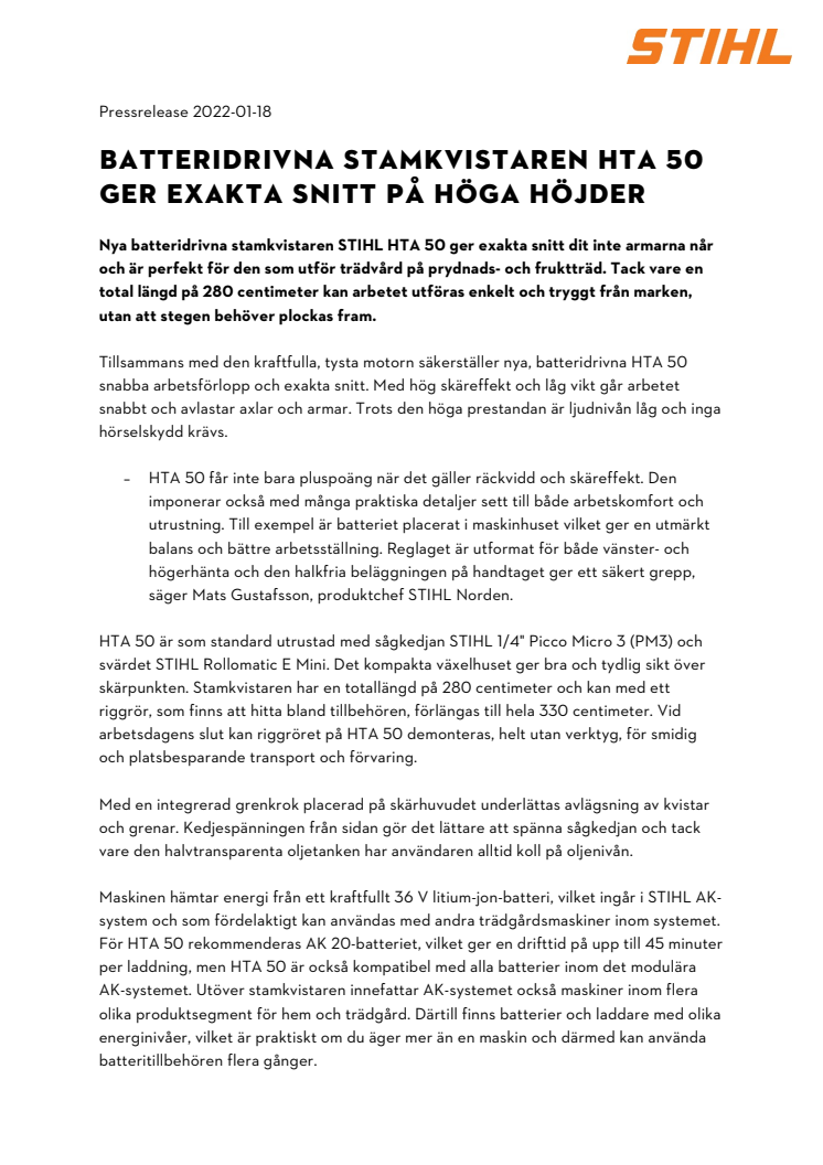 – HTA 50 får inte bara pluspoäng när det gäller räckvidd och skäreffekt. Den imponerar också med många praktiska detaljer sett till både arbetskomfort och utrustning. Till exempel är batteriet placerat i maskinhuset vilket ger en utmärkt balans och bättre arbetsställning. Reglaget är utformat för både vänster- och högerhänta och den halkfria beläggningen på handtaget ger ett säkert grepp, säger Mats Gustafsson, produktchef STIHL Norden.