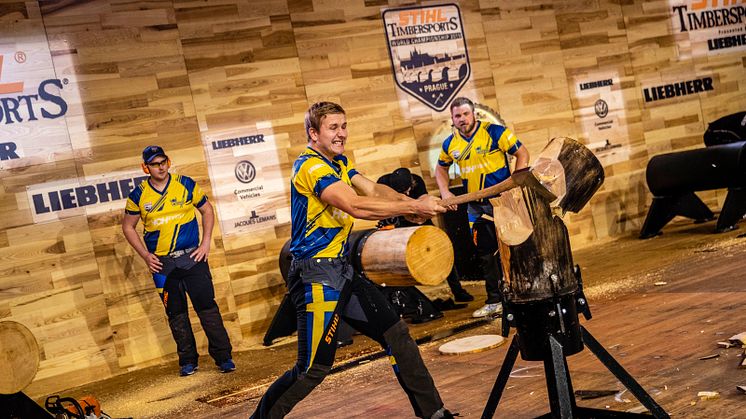 Det svenska landslaget i STIHL TIMBERSPORTS® under VM i Prag 2019. Foto: STIHL TIMBERSPORTS®.