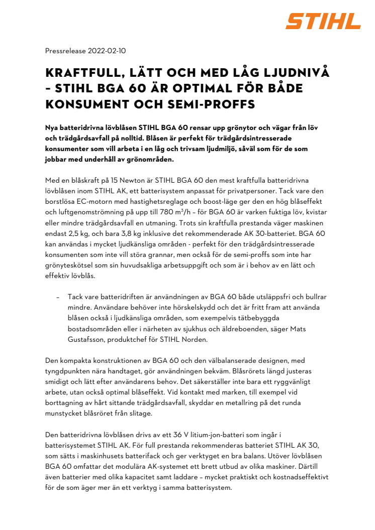 – Tack vare batteridriften är användningen av BGA 60 både utsläppsfri och bullrar mindre. Användare behöver inte hörskelskydd och det är fritt fram att använda blåsen också i ljudkänsliga områden, som exempelvis tätbebyggda bostadsområden eller i närheten av sjukhus och äldreboenden, säger Mats Gustafsson, produktchef för STIHL Norden.