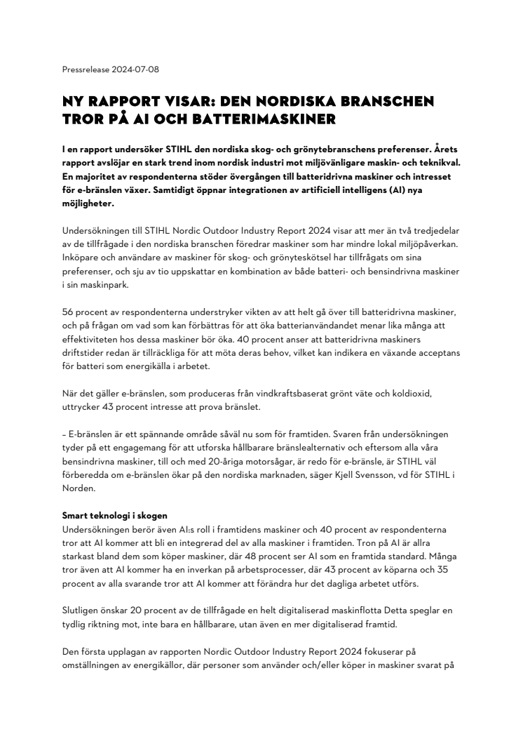 I en rapport undersöker STIHL den nordiska skog- och grönytebranschens preferenser. Årets rapport avslöjar en stark trend inom nordisk industri mot miljövänligare maskin- och teknikval. En majoritet av respondenterna stöder övergången till batteridrivna maskiner och intresset för e-bränslen växer. Samtidigt öppnar integrationen av artificiell intelligens (AI) nya möjligheter.