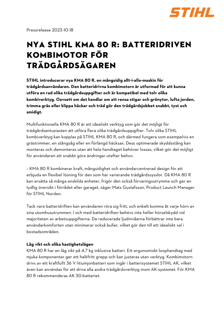 – KMA 80 R kombinerar kraft, mångsidighet och användarcentrerad design för att erbjuda en flexibel lösning för den som har varierande trädgårdssysslor. Då KMA 80 R kan ersätta så många enskilda enheter, frigör den också förvaringsutrymme och ger en tydlig översikt i förrådet eller garaget, säger Mats Gustafsson, Product Launch Manager för STIHL Norden.