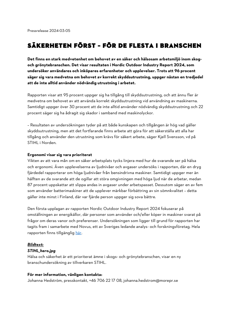 – Resultaten av undersökningen tyder på att både kunskapen och tillgången är hög vad gäller skyddsutrustning, men att det fortfarande finns arbete att göra för att säkerställa att alla har tillgång och använder den utrustning som krävs för säkert arbete, säger Kjell Svensson, vd på STIHL i Norden.