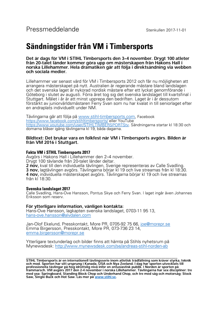 Tävlingarna går att följa på www.stihl-timbersports.com, Facebook https://www.facebook.com/stihltimbersports/ eller YouTube https://www.youtube.com/user/STIHLTIMBERSPORTStv. Sändningarna startar kl 18:30 och domarna blåser igång tävlingarna kl 19, båda dagarna.