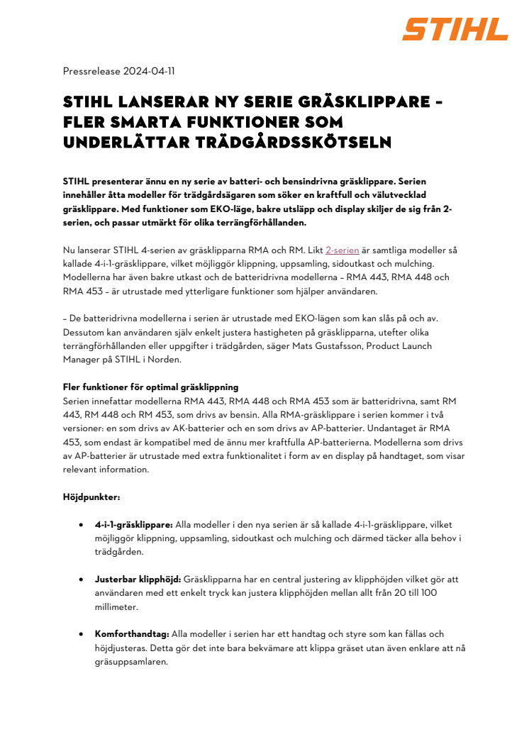 Nu lanserar STIHL 4-serien av gräsklipparna RMA och RM. Likt 2-serien är samtliga modeller så kallade 4-i-1-gräsklippare, vilket möjliggör klippning, uppsamling, sidoutkast och mulching. Modellerna har även bakre utkast och de batteridrivna modellerna – RMA 443, RMA 448 och RMA 453 – är utrustade med ytterligare funktioner som hjälper användaren.