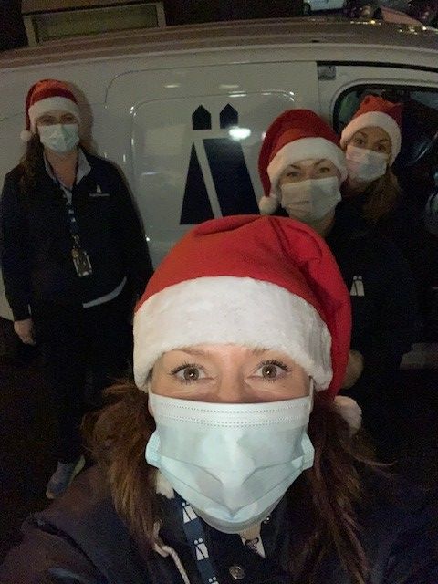 Personal från Ängelholmshem delar ut jubileumspresent till hyresgäster december 2020.