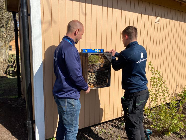 Mathias och Robin från Ängelholmshem monterar insektshotell
