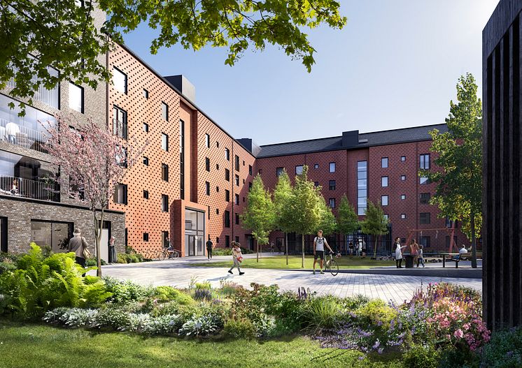 Exteriör vy över kvarteret Rökeriet i Ängelholm.