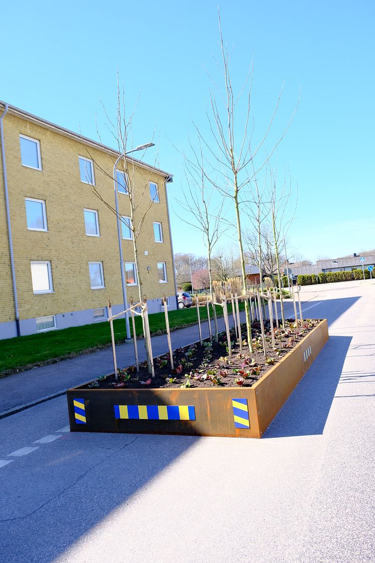 Trädprojekt med planteringslådor i vägbanan hos Ängelholmshem.