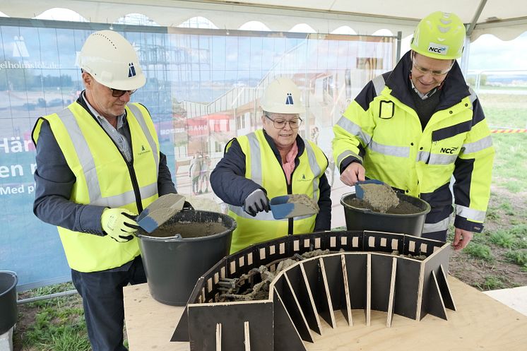 Sten Christiansson styrelseordförande Ängelholmslokaler, Elisabeth Kullenberg kommunfullmäktiges ordförande, Magnus Knöös avdelningschef NCC