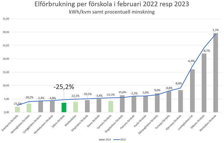 Graf som beskriver minskning i energiförbrukning på förskolor februari 2021 jämfört med februari 2022
