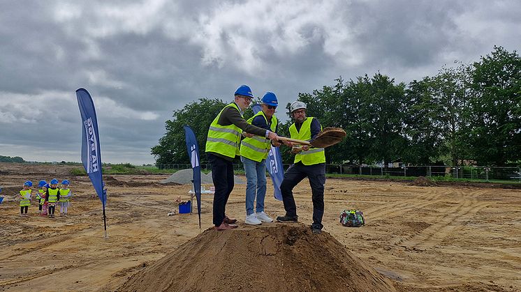 Under spadtaget fanns barn från Torlarps förskola på plats för att bistå Robin Holmberg (M) kommunstyrelsens ordförande, Sten Christiansson (M) styrelseordförande Ängelholmslokaler samt Göran Lindqvist från byggentreprenören HA Bygg med det symboliska spadtaget.