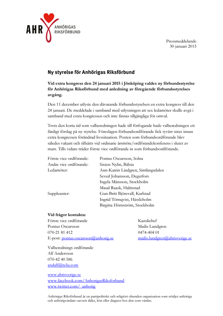 Vid extra kongress den 24 januari 2015 i Jönköping valdes ny förbundsstyrelse för Anhörigas Riksförbund med anledning av föregående förbundsstyrelses avgång.