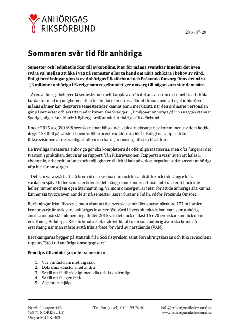 Semester och ledighet lockar till avkoppling. Men för många svenskar innebär det även svåra val mellan att åka i väg på semester eller ta hand om nära och kära i behov av vård. Enligt beräkningar gjorda av Anhörigas Riksförbund och Frösunda Omsorg finns det nära 1,3 miljoner anhöriga i Sverige som regelbundet ger omsorg till någon som står dem nära.