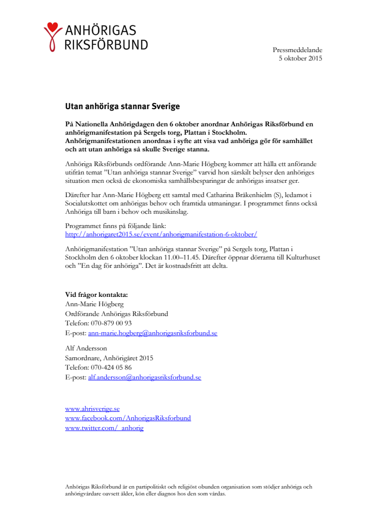 På Nationella Anhörigdagen den 6 oktober anordnar Anhörigas Riksförbund en anhörigmanifestation på Sergels torg, Plattan i Stockholm. Anhörigmanifestationen anordnas i syfte att visa vad anhöriga gör för samhället och att utan anhöriga så skulle Sverige stanna.