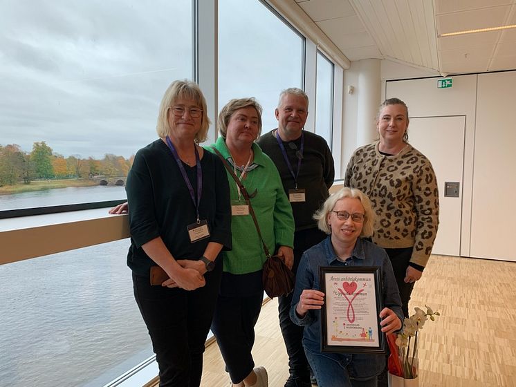 Fr v Anna-Karin Olsson, Karin Carlsson, Niklas Christiansson och Pernilla Gauffen. På huk: Therese Lundgren, verksamhetschef för Anhörigcentrum.