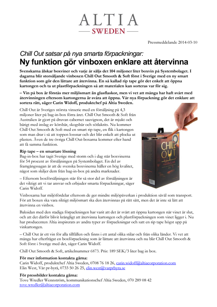 Svenskarna älskar boxviner och varje år säljs det 104 miljoner liter boxvin på Systembolaget. I dagarna blir storsäljande vinboxen Chill Out Smooth & Soft först i Sverige med en ny smart funktion som gör den lättare att återvinna. En så kallad rip tape gör det enkelt att öppna kartongen och ta ut plastförpackningen så att materialen kan sorteras var för sig.