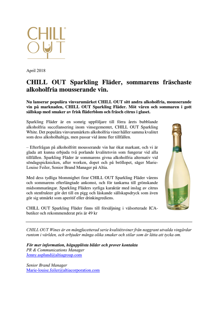 Nu lanserar populära vinvarumärket CHILL OUT sitt andra alkoholfria, mousserande vin på marknaden, CHILL OUT Sparkling Fläder. Möt våren och sommaren i gott sällskap med smaker av frisk fläderblom och fräsch citrus i glaset.