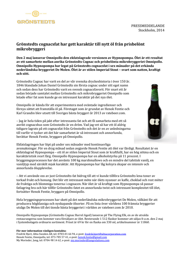 Den 2 maj lanserar Omnipollo den ekfatslagrade versionen av Hypnopompa. Ölet är ett resultat av ett samarbete mellan anrika Grönstedts Cognac och prisbelönta mikrobryggeriet Omnipollo. Omnipollo Hypnopompa har legat på Grönstedts cognacsfat i sex månader på det erkända nederländska bryggeriet De Molen. Ölet är av stilen Imperial Stout – svart som natten, kraftigt och sött.