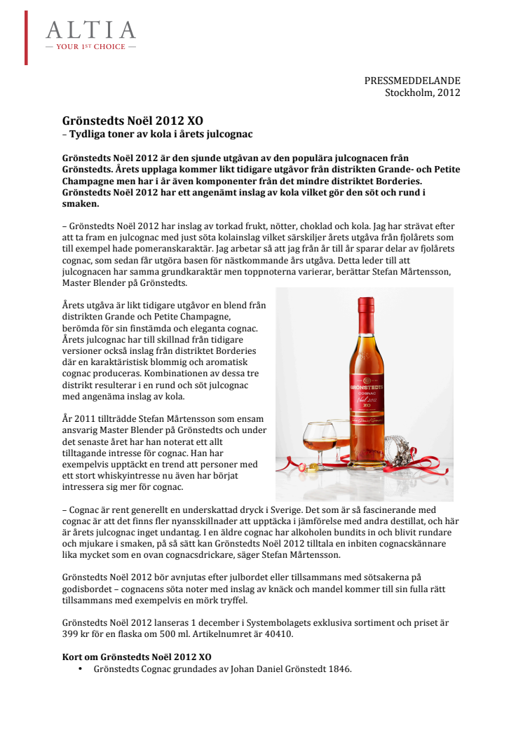 Grönstedts Noël 2012 är den sjunde utgåvan av den populära julcognacen från Grönstedts. Årets upplaga kommer likt tidigare utgåvor från distrikten Grande- och Petite Champagne men har i år även komponenter från det mindre distriktet Borderies. Grönstedts Noël 2012 har ett angenämt inslag av kola vilket gör den söt och rund i smaken.