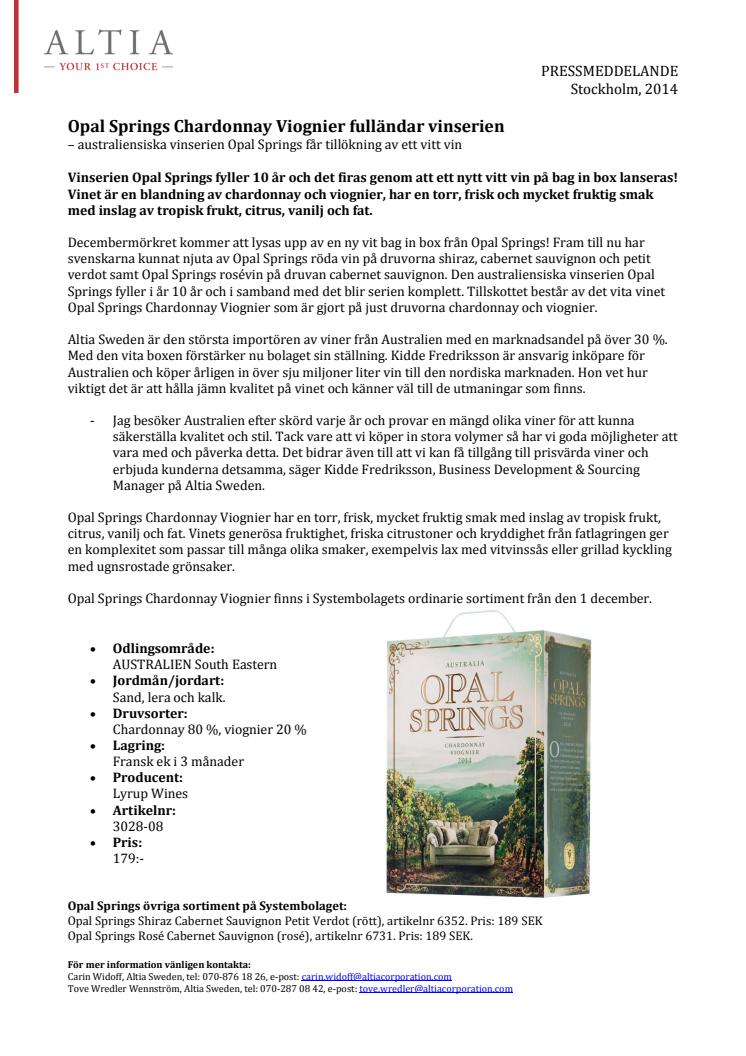 Vinserien Opal Springs fyller 10 år och det firas genom att ett nytt vitt vin på bag in box lanseras! Vinet är en blandning av chardonnay och viognier, har en torr, frisk och mycket fruktig smak med inslag av tropisk frukt, citrus, vanilj och fat.