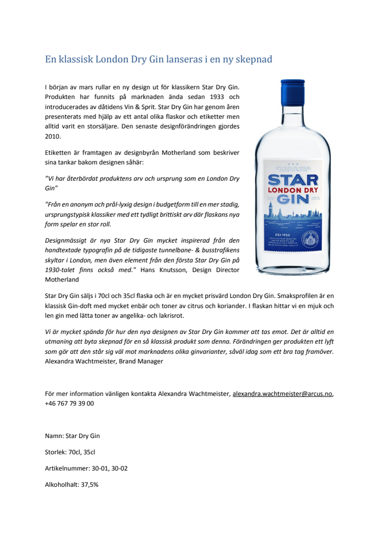 I början av mars rullar en ny design ut för klassikern Star Dry Gin. Produkten har funnits på marknaden ända sedan 1933 och introducerades av dåtidens Vin & Sprit. Star Dry Gin har genom åren presenterats med hjälp av ett antal olika flaskor och etiketter men alltid varit en storsäljare. Den senaste designförändringen gjordes 2010.