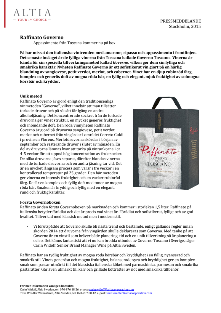 Raffinato Governo finns på box i Systembolagets beställningssortiment från den 1 april och på flaska från den 2 maj.