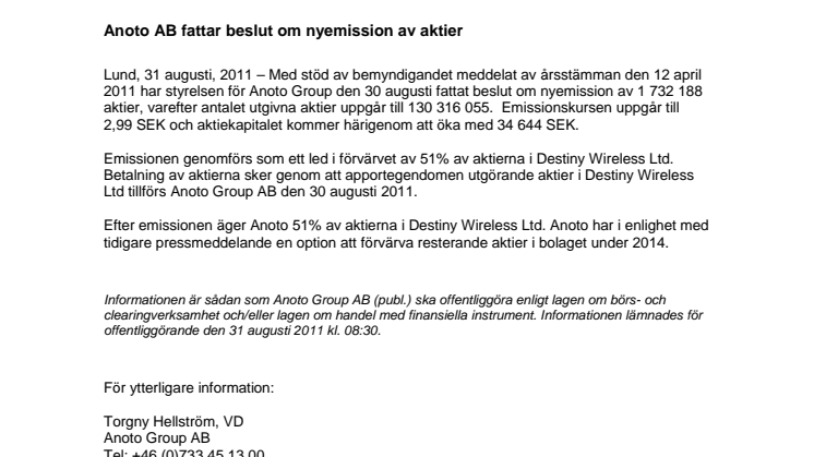 Efter emissionen äger Anoto 51% av aktierna i Destiny Wireless Ltd. Anoto har i enlighet med tidigare pressmeddelande en option att förvärva resterande aktier i bolaget under 2014.