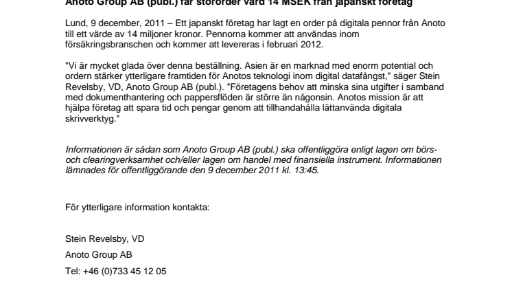 Lund, 9 december, 2011 – Ett japanskt företag har lagt en order på digitala pennor från Anoto till ett värde av 14 miljoner kronor. Pennorna kommer att användas inom försäkringsbranschen och kommer att levereras i februari 2012.