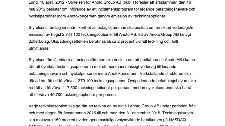 Lund, 10 april, 2012 - Styrelsen för Anoto Group AB (publ.) föreslår att årsstämman den 10 maj 2012 beslutar om införande av ett incitamentsprogram för ledande befattningshavare och nyckelpersoner inom Anotokoncernen genom emission av teckningsoptioner.
