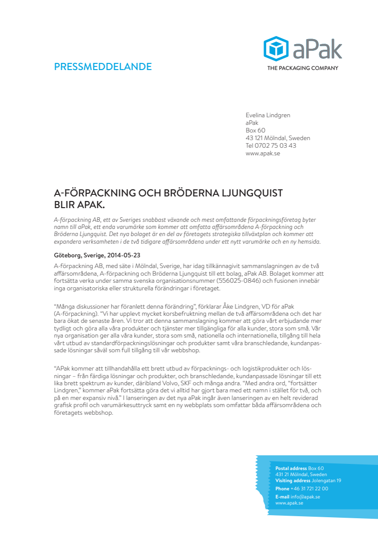 A-förpackning AB, ett av Sveriges snabbast växande och mest omfattande förpackningsföretag byter namn till aPak, ett enda varumärke som kommer att omfatta affärsområdena A-förpackning och Bröderna Ljungquist. Det nya bolaget är en del av företagets strategiska tillväxtplan och kommer att expandera verksamheten i de två tidigare affärsområdena under ett nytt varumärke och en ny hemsida.