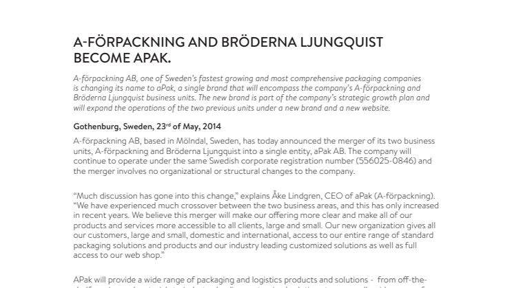 Ljungquist into a single entity, aPak AB. The company will continue to operate