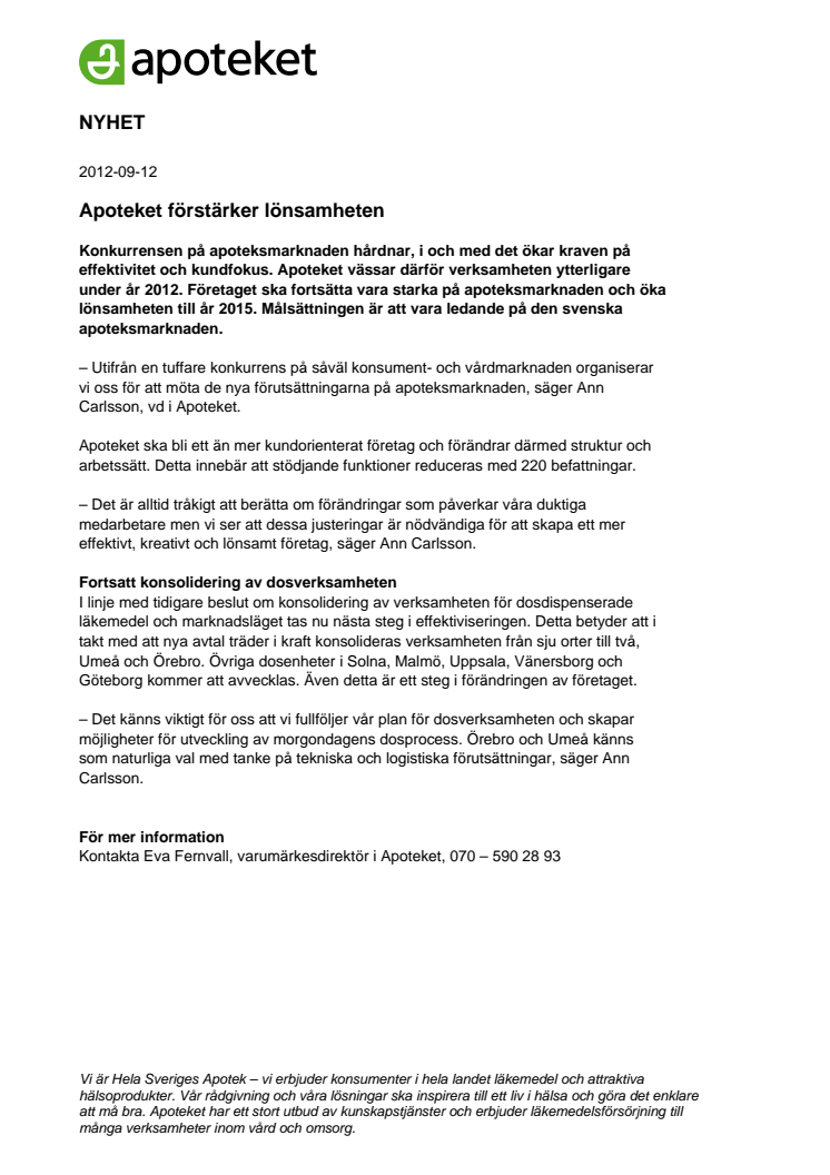 Konkurrensen på apoteksmarknaden hårdnar, i och med det ökar kraven på effektivitet och kundfokus. Apoteket vässar därför verksamheten ytterligare under år 2012. Företaget ska fortsätta vara starka på apoteksmarknaden och öka lönsamheten till år 2015. Målsättningen är att vara ledande på den svenska apoteksmarknaden.