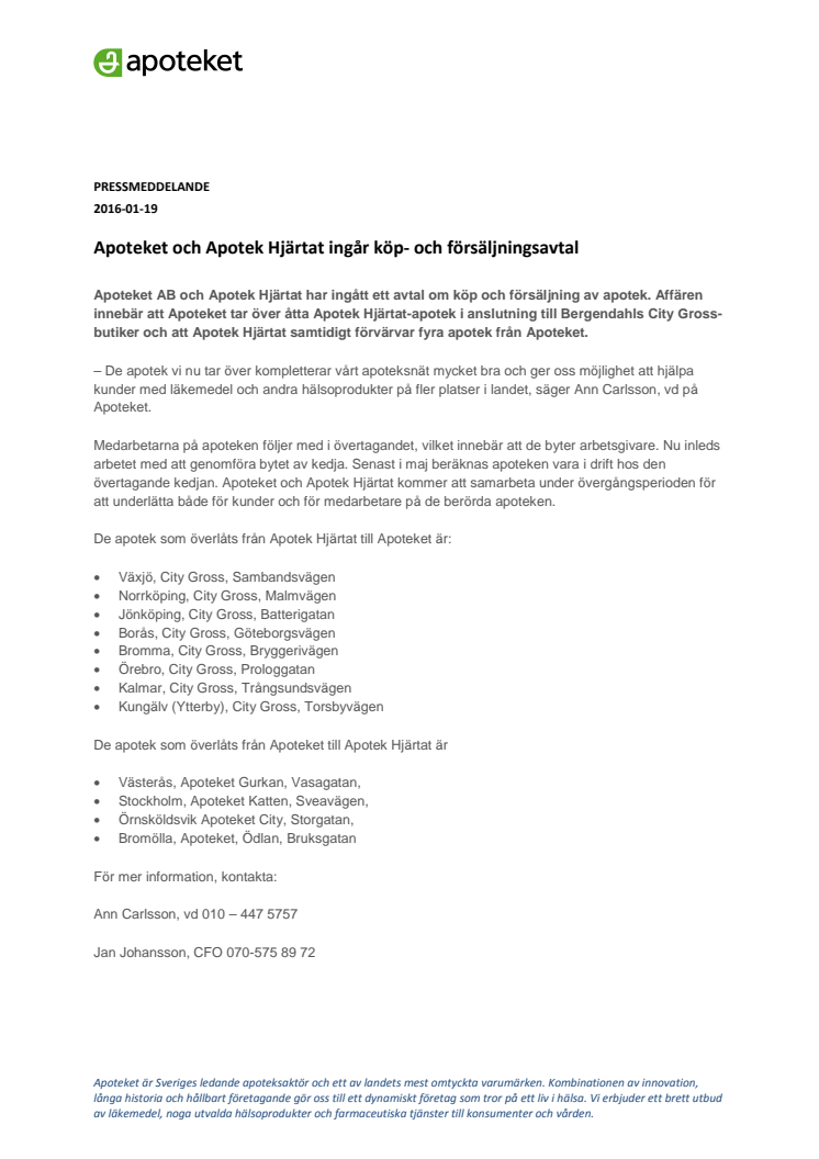 Apoteket AB och Apotek Hjärtat har ingått ett avtal om köp och försäljning av apotek. Affären innebär att Apoteket tar över åtta Apotek Hjärtat-apotek i anslutning till Bergendahls City Gross-butiker och att Apotek Hjärtat samtidigt förvärvar fyra apotek från Apoteket.