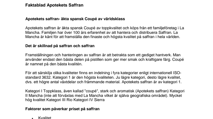 Flera recept innehåller Apotekets klassiska saffran som är av särskild hög kvalitet, även kallad ”coupé”. Den är odlad och skördad i La Mancha, ett distrikt i Spanien som är känt för att framställa den finaste och högsta kvalitet på saffran i hela världen.