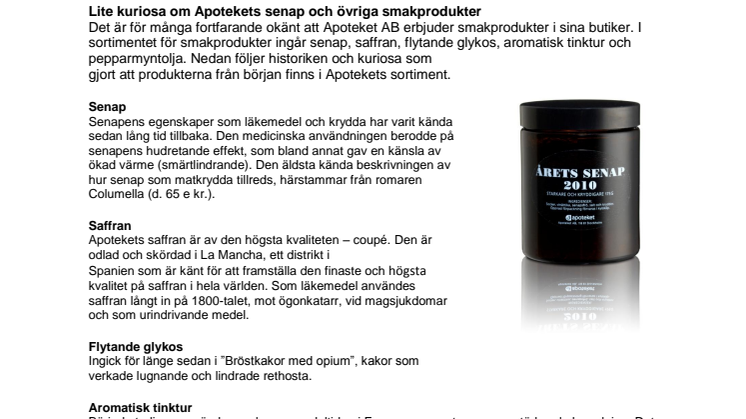 Sedan urminnes tider har Apoteket satt smak och färg på julens godsaker. I år satsar Apoteket stort på sina smakprodukter och har tagit fram en ny senapssmak som är både starkare och kryddigare med toner av peppar och ingefära.