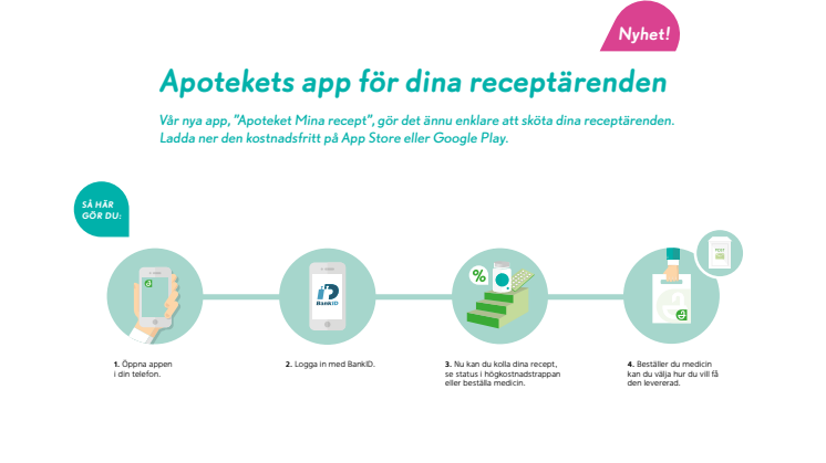 Nu går det snabbare att beställa och hämta ut läkemedel på Apoteket nära dig - med appen Mina Recept. I appen Apotekets Mina Recept finns allt om recept och det är enkelt att beställa till valfri adress. Appen är kostnadsfri och det enda som behövs är ett mobilt BankID.