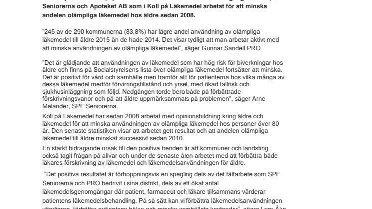 ”Det är glädjande att användningen av läkemedel som har hög risk för biverkningar hos äldre och finns på Socialstyrelsens lista över olämpliga läkemedel fortsätter att minska. Det är positivt för vård och samhälle men framför allt för patienterna hos vilka många av dessa läkemedel medför förvirringstillstånd och yrsel, med ökad fallrisk och sjukhusinläggning som följd. Nedgången torde bero både på förbättrade förskrivningsvanor och på att äldre uppmärksammats på problemen", säger Arne Melander, SPF Seniorerna.