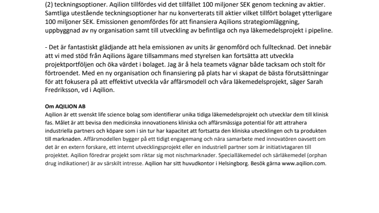 - Det är fantastiskt glädjande att hela emissionen av units är genomförd och fulltecknad. Det innebär att vi med stöd från Aqilions ägare tillsammans med styrelsen kan fortsätta att utveckla projektportföljen och öka värdet i bolaget. Jag är å hela teamets vägnar både tacksam och stolt för förtroendet. Med en ny organisation och finansiering på plats har vi skapat de bästa förutsättningar för att fokusera på att effektivt utveckla vår affärsmodell och våra läkemedelsprojekt, säger Sarah Fredriksson, vd i Aqilion.