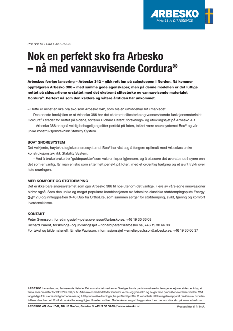Arbeskos forrige lansering – Arbesko 342 – gikk rett inn på salgstoppen i Norden. Nå kommer oppfølgeren Arbesko 386 – med samme gode egenskaper, men på denne modellen er det luftige nettet på sidepartiene erstattet med det ekstremt slitesterke og vannavvisende materialet Cordura®. Perfekt nå som den kaldere og våtere årstiden har ankommet.