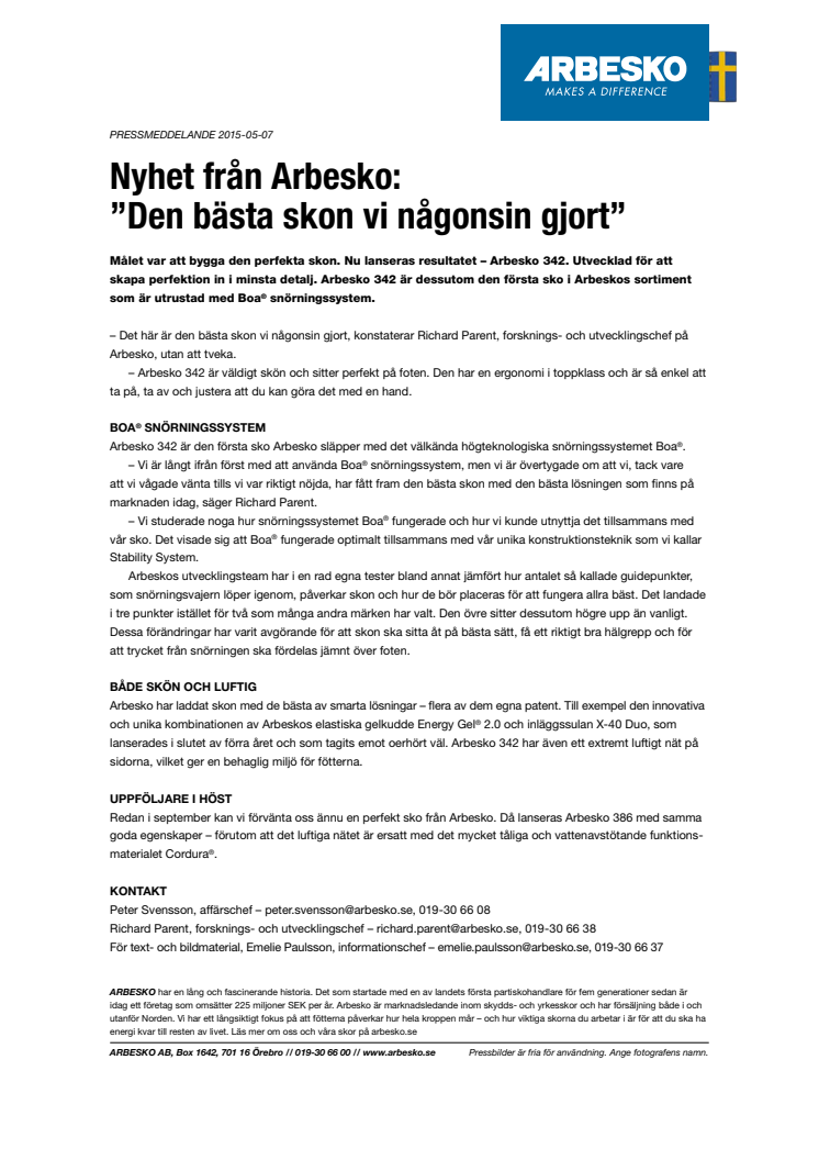 Målet var att bygga den perfekta skon. Nu lanseras resultatet – Arbesko 342. Utvecklad för att skapa perfektion in i minsta detalj. Arbesko 342 är dessutom den första sko i Arbeskos sortiment som är utrustad med Boa® snörningssystem.