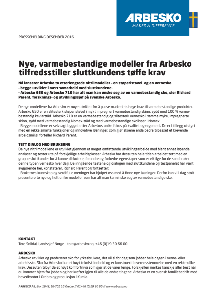 De nye modellene fra Arbesko er nøye utviklet for å passe markedets høye krav til varmebestandige produkter. Arbesko 650 er en slitesterk støperistøvel i mykt impregnert varmebestandig skinn, sydd med 100 % varmebestandig kevlartråd. Arbesko 710 er en varmebestandig og slitesterk vernesko i samme myke, impregnerte skinn, sydd med varmebestandig Nomex-tråd og med varmebestandige skolisser i Nomex.
