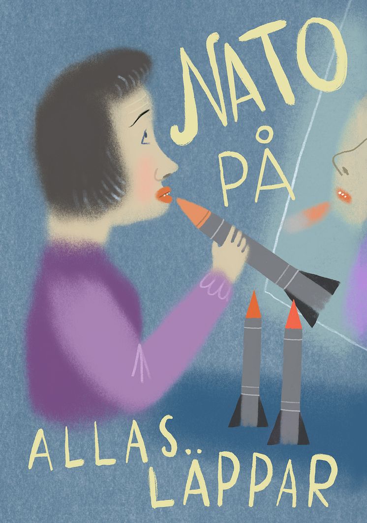 Bild från Tecknaruppropets utställning "Nato på allas läppar" som visas på Arbetets museum 31 aug 2024–26 jan 2025.