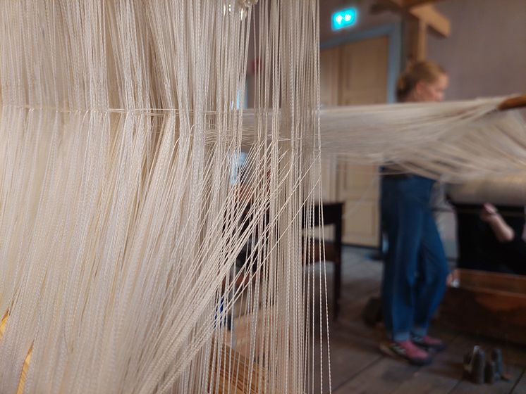 Solvning på K. A. Almgren sidenväveri & museum. En av museets lärlingar i bakgrunden. Museet är utnämnt till Årets Arbetslivsmuseum 2024.
