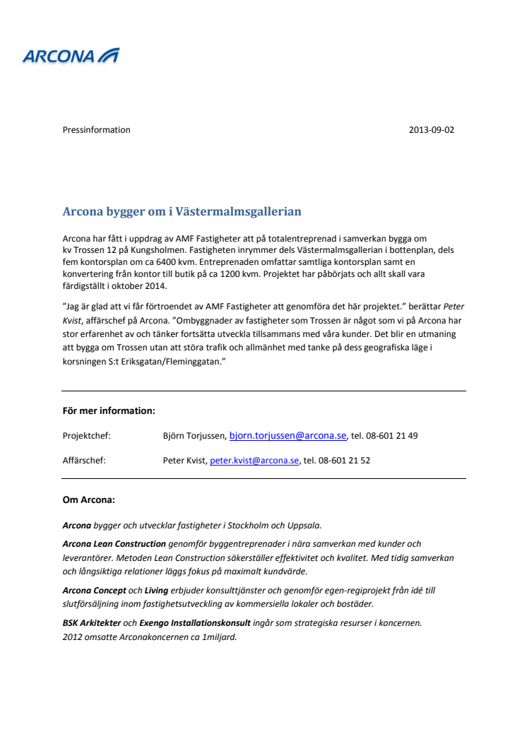 kv Trossen 12 på Kungsholmen. Fastigheten inrymmer dels Västermalmsgallerian i bottenplan, dels fem kontorsplan om ca 6400 kvm. Entreprenaden omfattar samtliga kontorsplan samt en konvertering från kontor till butik på ca 1200 kvm. Projektet har påbörjats och allt skall vara färdigställt i oktober 2014.