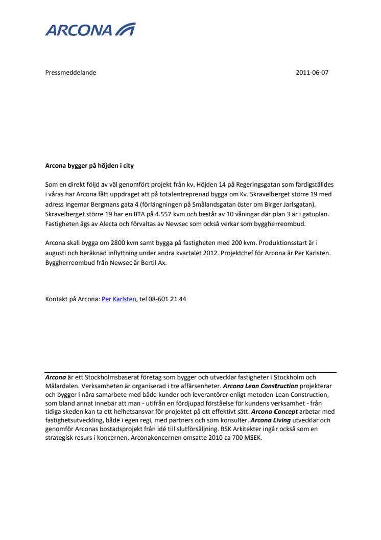 Arcona har fått i uppdrag av Alecta/Newsec att bygga om och bygga på fastigheten Skravelberget större 19 på Ingemar Bergmans gata 4.