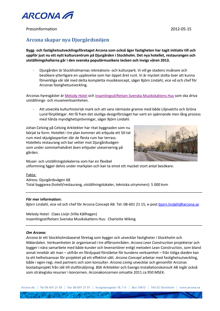 Bygg- och fastighetsutvecklingsföretaget Arcona som också äger fastigheten har tagit initiativ till och uppför just nu ett nytt kulturcentrum på Djurgården i Stockholm. Det nya hotellet, restaurangen och utställningshallarna går i den svenska populärmusikens tecken och invigs våren 2013.