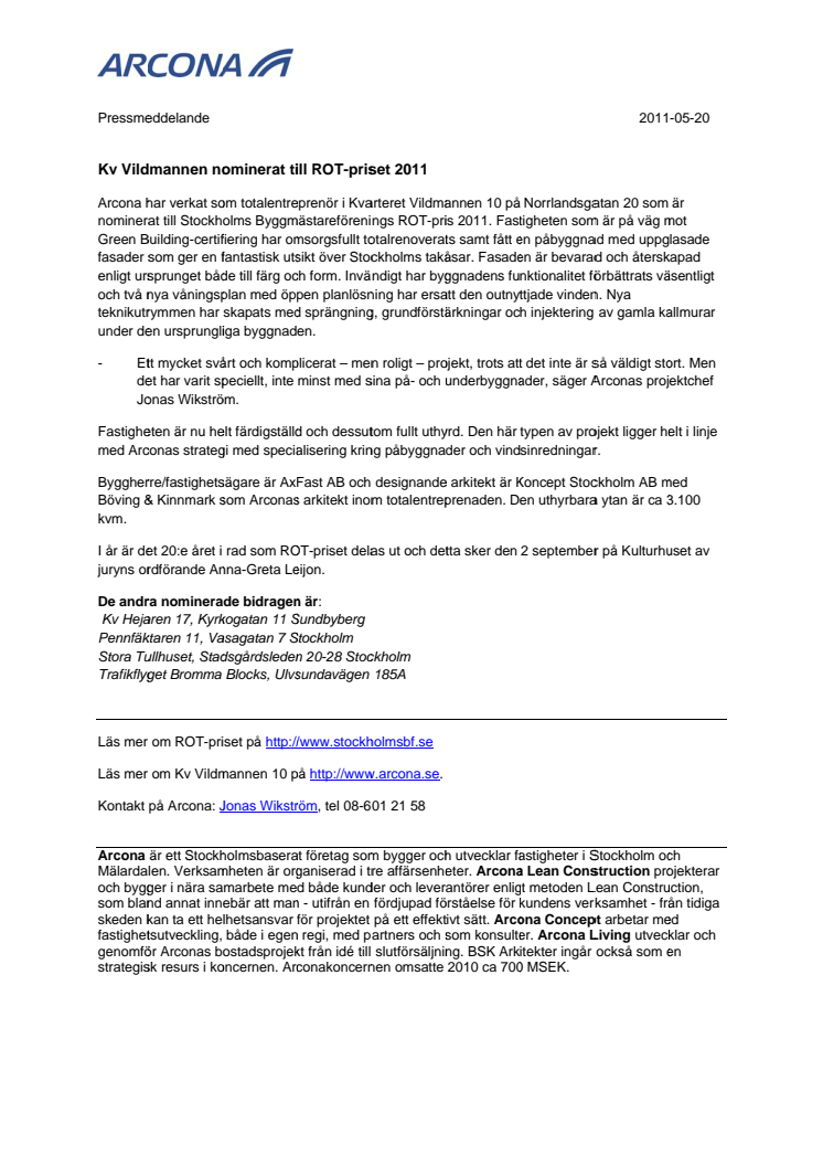 Arcona har verkat som totalentreprenör i Kvarteret Vildmannen 10 på Norrlandsgatan 20 som är nominerat till Stockholms Byggmästareförenings ROT-pris 2011. Fastigheten som är på väg mot Green Building-certifiering har omsorgsfullt totalrenoverats samt fått en påbyggnad med uppglasade fasader som ger en fantastisk utsikt över Stockholms takåsar. Fasaden är bevarad och återskapad enligt ursprunget både till färg och form. Invändigt har byggnadens funktionalitet förbättrats väsentligt och två nya våningsplan med öppen planlösning har ersatt den outnyttjade vinden. Nya teknikutrymmen har skapats med sprängning, grundförstärkningar och injektering av gamla kallmurar under den ursprungliga byggnaden.