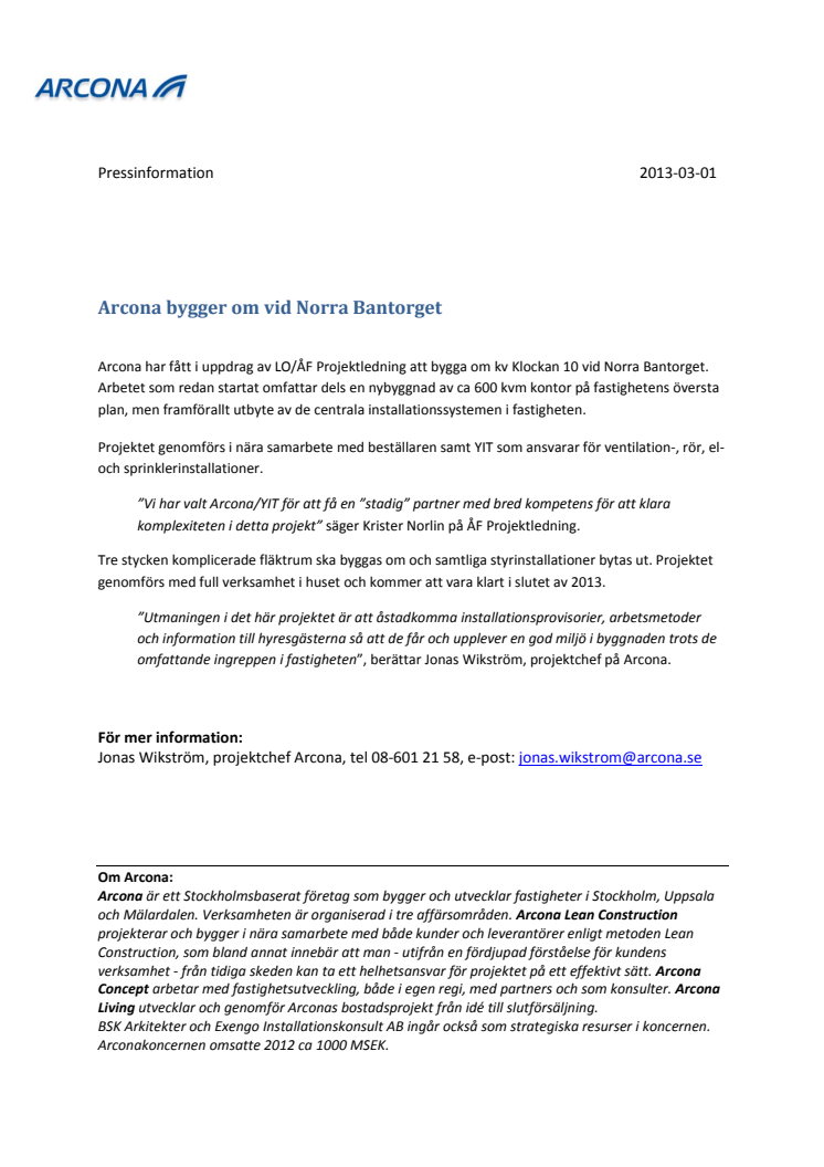 Arcona har fått i uppdrag av LO/ÅF Projektledning att bygga om kv Klockan 10 vid Norra Bantorget. Arbetet som redan startat omfattar dels en nybyggnad av ca 600 kvm kontor på fastighetens översta plan, men framförallt utbyte av de centrala installationssystemen i fastigheten.