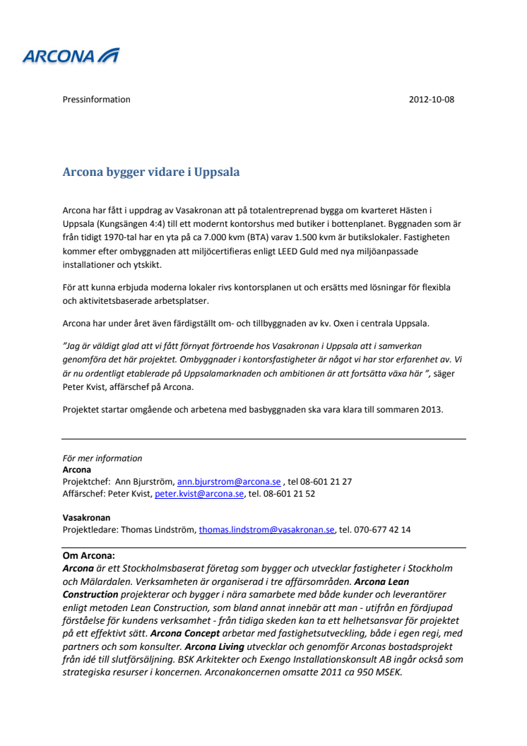 ”Jag är väldigt glad att vi fått förnyat förtroende hos Vasakronan i Uppsala att i samverkan genomföra det här projektet. Ombyggnader i kontorsfastigheter är något vi har stor erfarenhet av. Vi är nu ordentligt etablerade på Uppsalamarknaden och ambitionen är att fortsätta växa här ”, säger Peter Kvist, affärschef på Arcona.