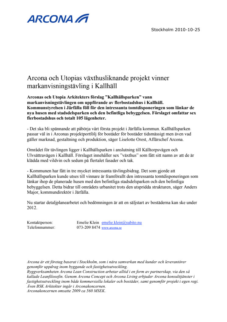 Arconas och Utopia Arkitekters förslag ”Kallhällsparken” vann markanvisningstävlingen om uppförande av flerbostadshus i Kallhäll. Kommunstyrelsen i Järfälla föll för den intressanta tomtdisponeringen som länkar de nya husen med stadsdelsparken och den befintliga bebyggelsen. Förslaget omfattar sex flerbostadshus och totalt 105 lägenheter.